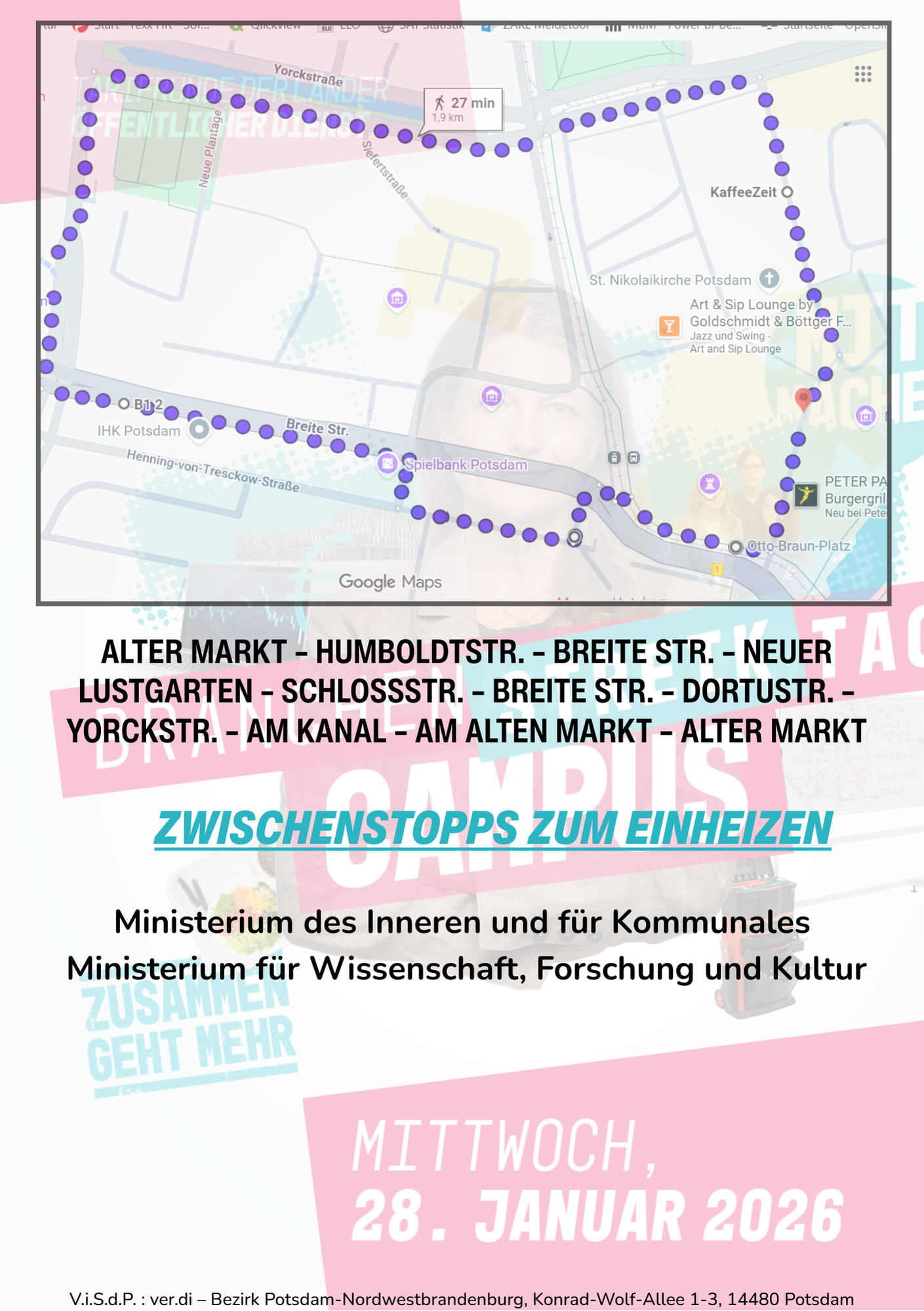 Ab 11:30 Uhr treffen wir uns zur zentralen Kundgebung am Alten Markt in Potsdam, anschließend gehen wir gemeinsam auf Demonstration durch die Innenstadt. Zusammen machen wir deutlich: Gute Lehre, Forschung und Verwaltung brauchen gute Arbeitsbedingungen, faire Bezahlung und Verlässlichkeit – für alle Beschäftigtengruppen, auch für studentische Beschäftigte.